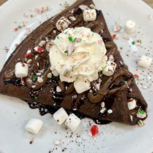 Wrap yourself in the flavours of the holidays with every warm, gooey bite. This festive favourite starts with a chocolate, freshly-made crêpe filled with silky chocolate-hazelnut spread 🍫, soft melty marshmallows ☁️, and a cool whisper of crushed peppermint candy 🍬 that adds that irresistible holiday sparkle. A cloud of whipped cream ❄️ melts gently into the chocolate for the ultimate cozy indulgence.